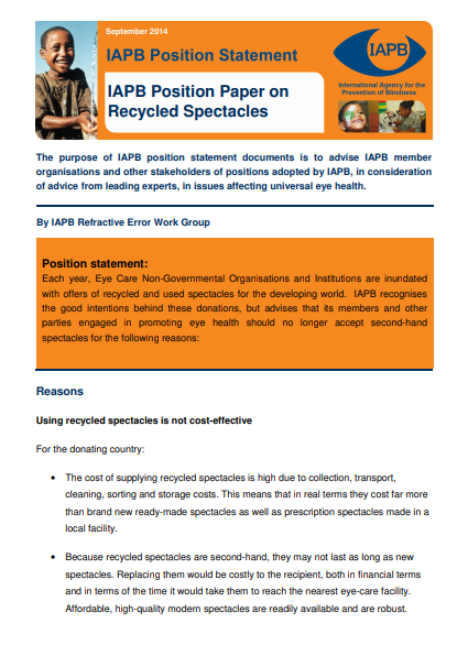 MembershipIt is shocking that even today, an estimated 120 million people live a severely disadvantaged life, unable to see things at a distance because they do not have a pair of spectacles. Estimates suggest another half billion or more—yes, Billion—are also suffering from near vision problems. They cannot read or perform near tasks, again simply for want of spectacles. The recently published IAPB report on spectacle coverage found that in some countries less than 10% of the people needing spectacles to correct serious levels of vision loss were receiving them.