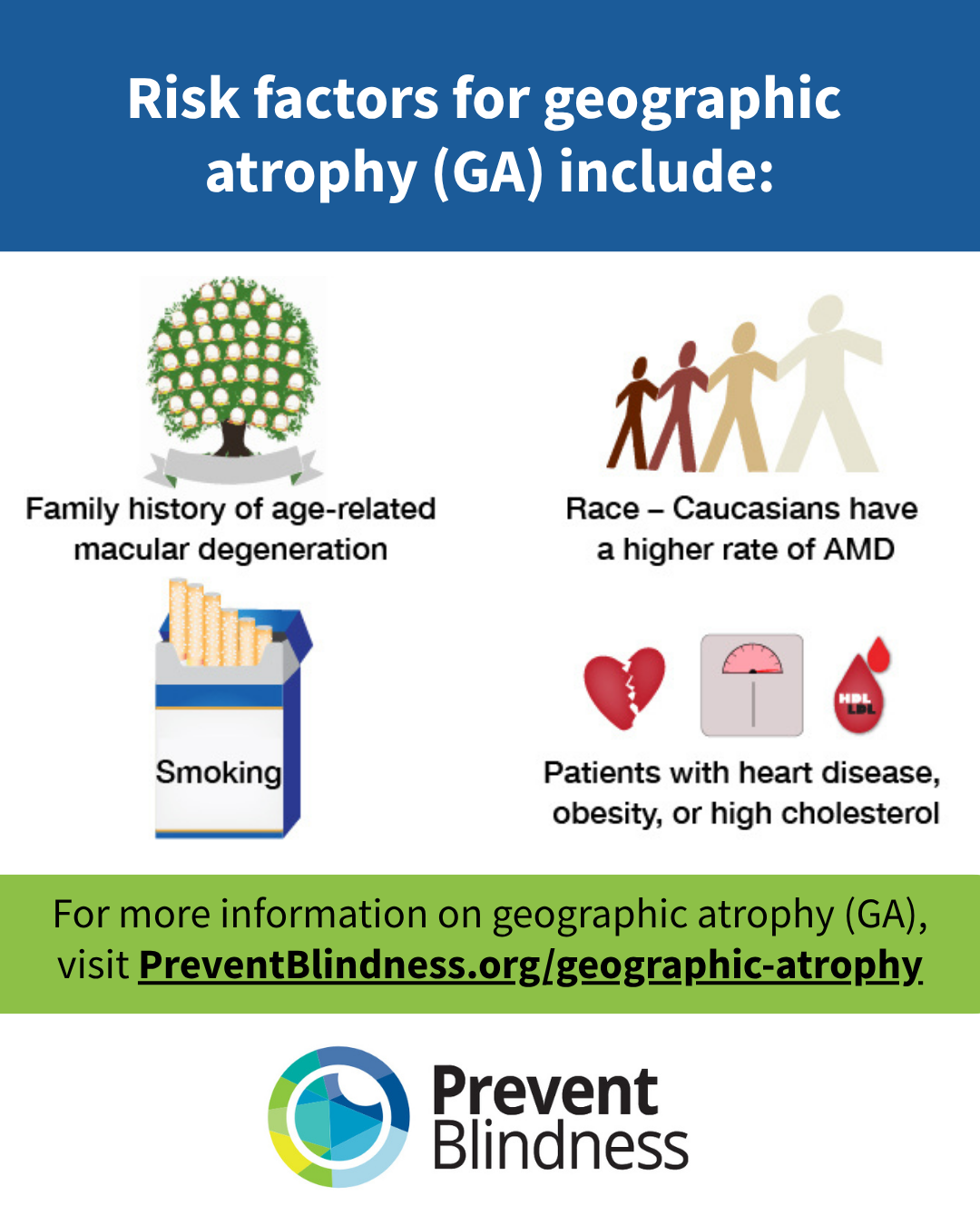 For more information on GA, visit https://preventblindness.org/geographic-atrophy. For more information on wet and dry AMD, visit https://preventblindness.org/amd-age-related-macular-degeneration/. For more information on low vision and mental wellness, visit https://lowvision.preventblindness.org.
